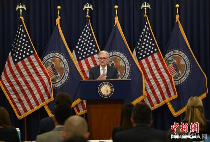 图为美联储主席鲍威尔当天在货币政策例会后出席记者会。 中新社记者 陈孟统 摄