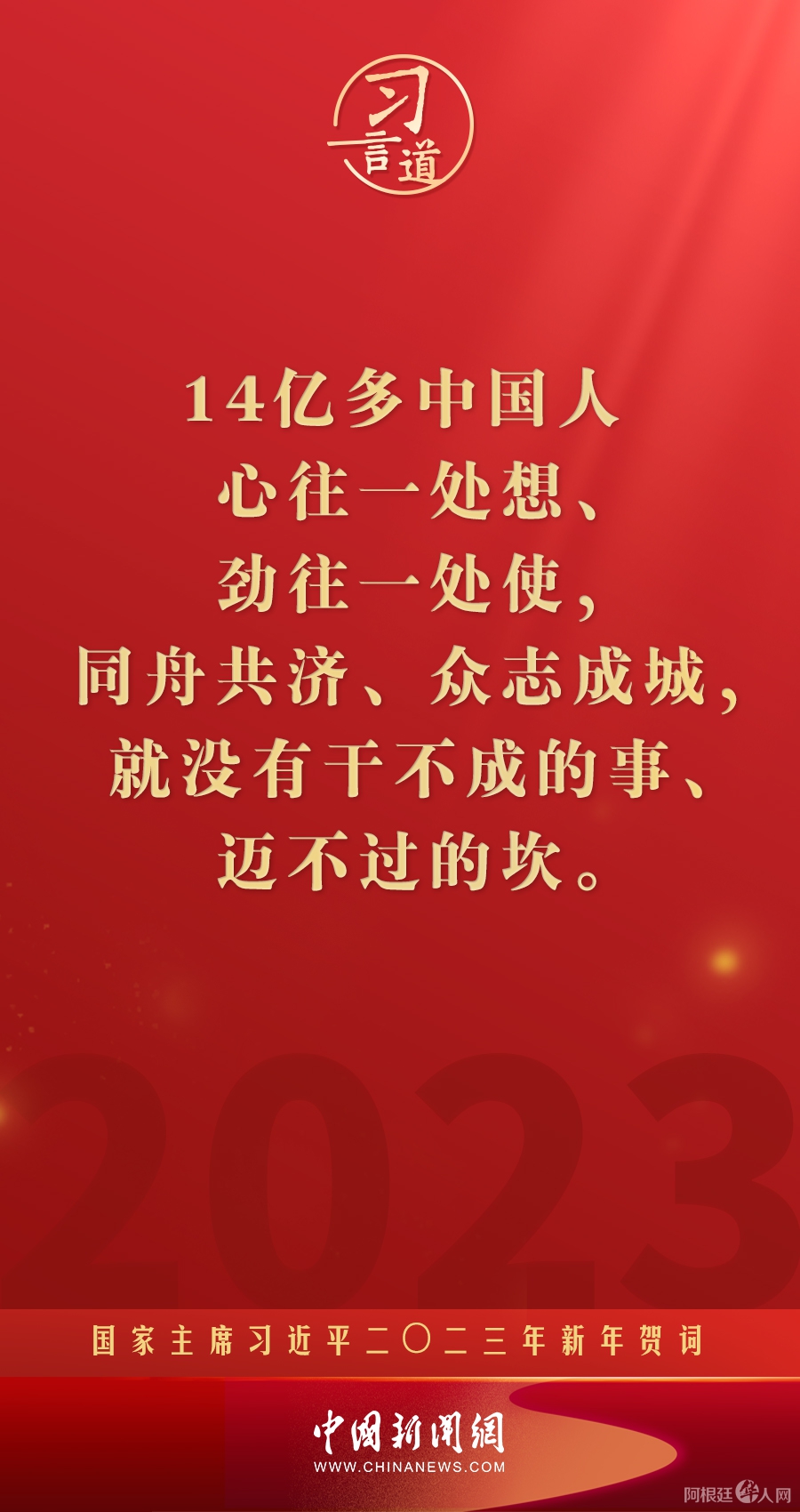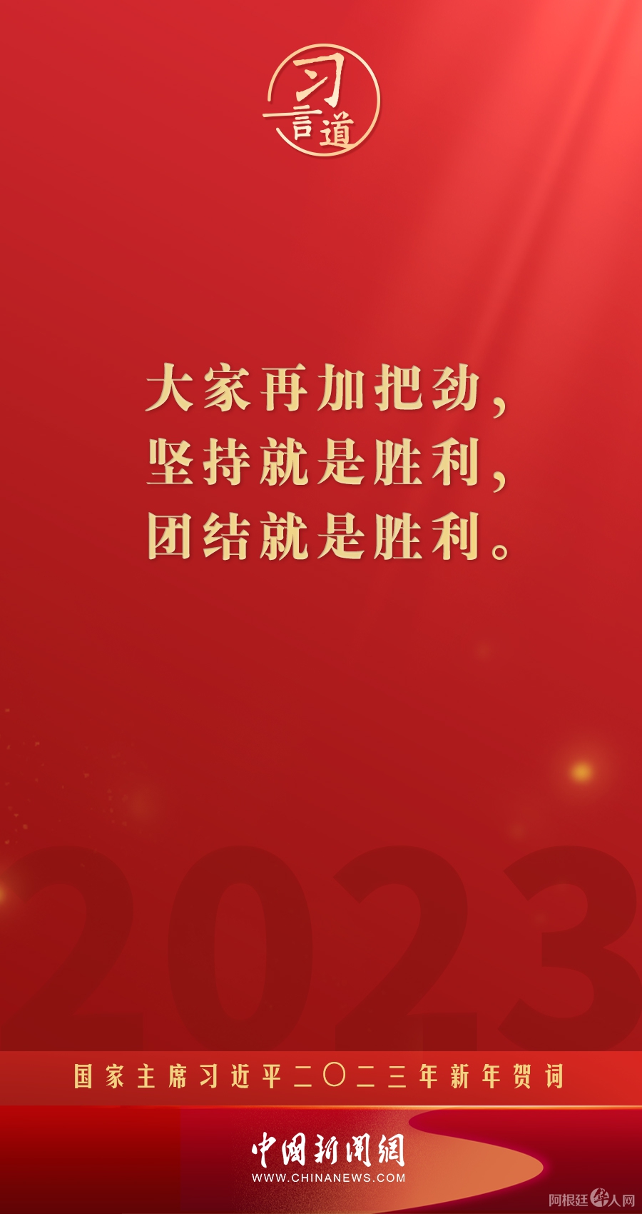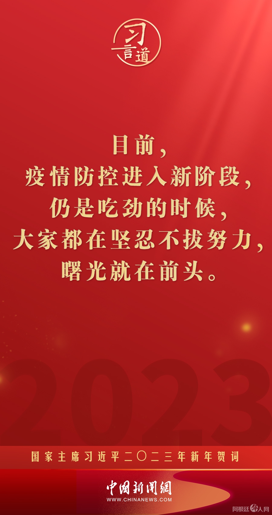 习言道|再加把劲!习近平“新年金句”暖心提气 中国新闻网 • 2023-01-02 04:43• 收藏本文 新年前夕,国家主席习近平通过中央广播电视总台和互联网,发表了二〇二三年新年贺词。他指出—— 转载本网稿件,原则上需要书面授权,不得篡改稿件主题。本网随时有权要求第三方停止侵权行为。 本网所载内容或图片,若涉及侵权,请联系删除。 02 ___________ 2023/01 习言道|再加把劲!习近平“新年金句”暖心提气 新年前夕,国家主席习近平通过中央广播电视总台和互联网,发表了二〇二三年新年贺词。他指出—— [ 微信长按识别二维码或扫码查看分享内容 ]