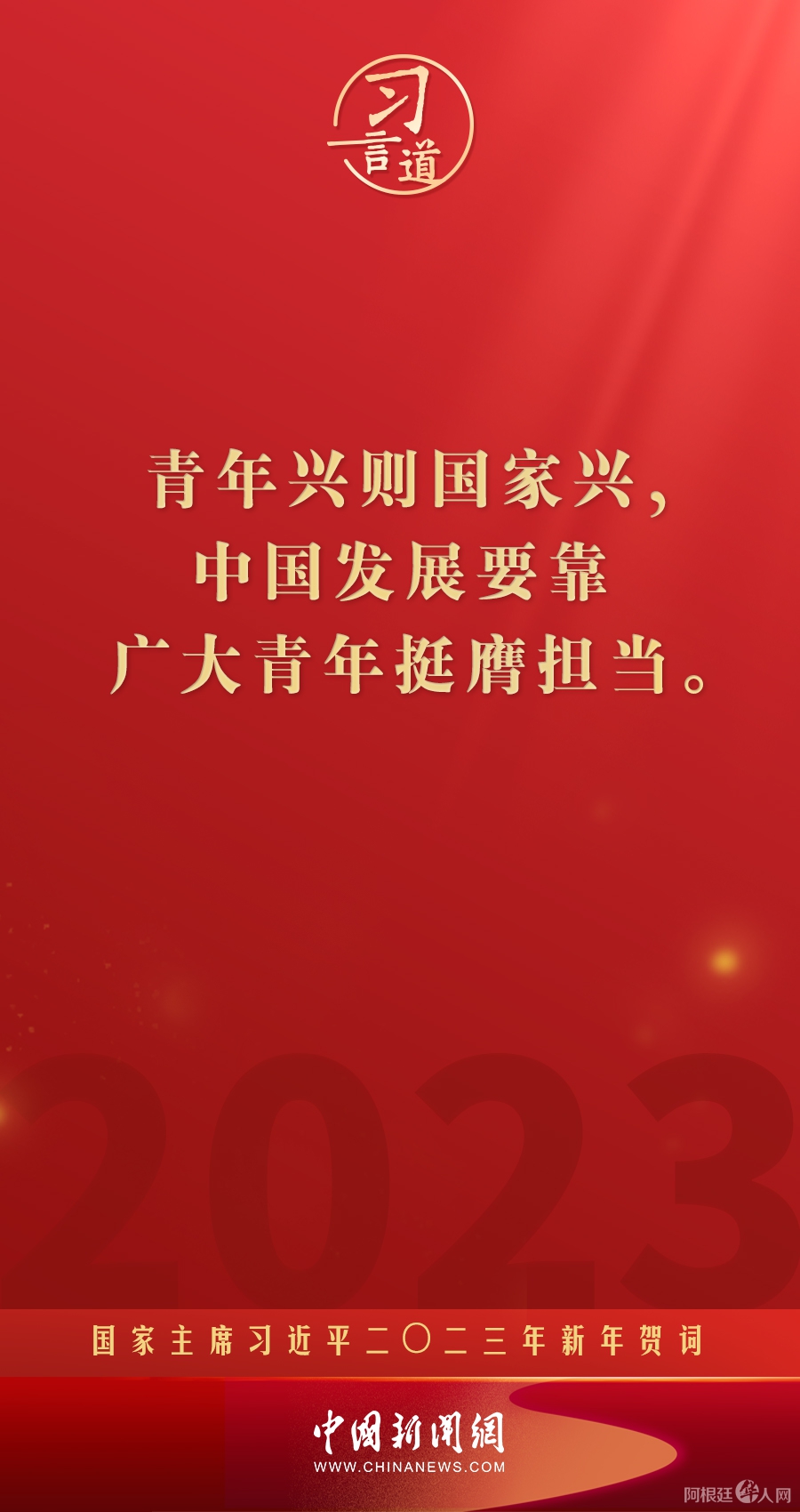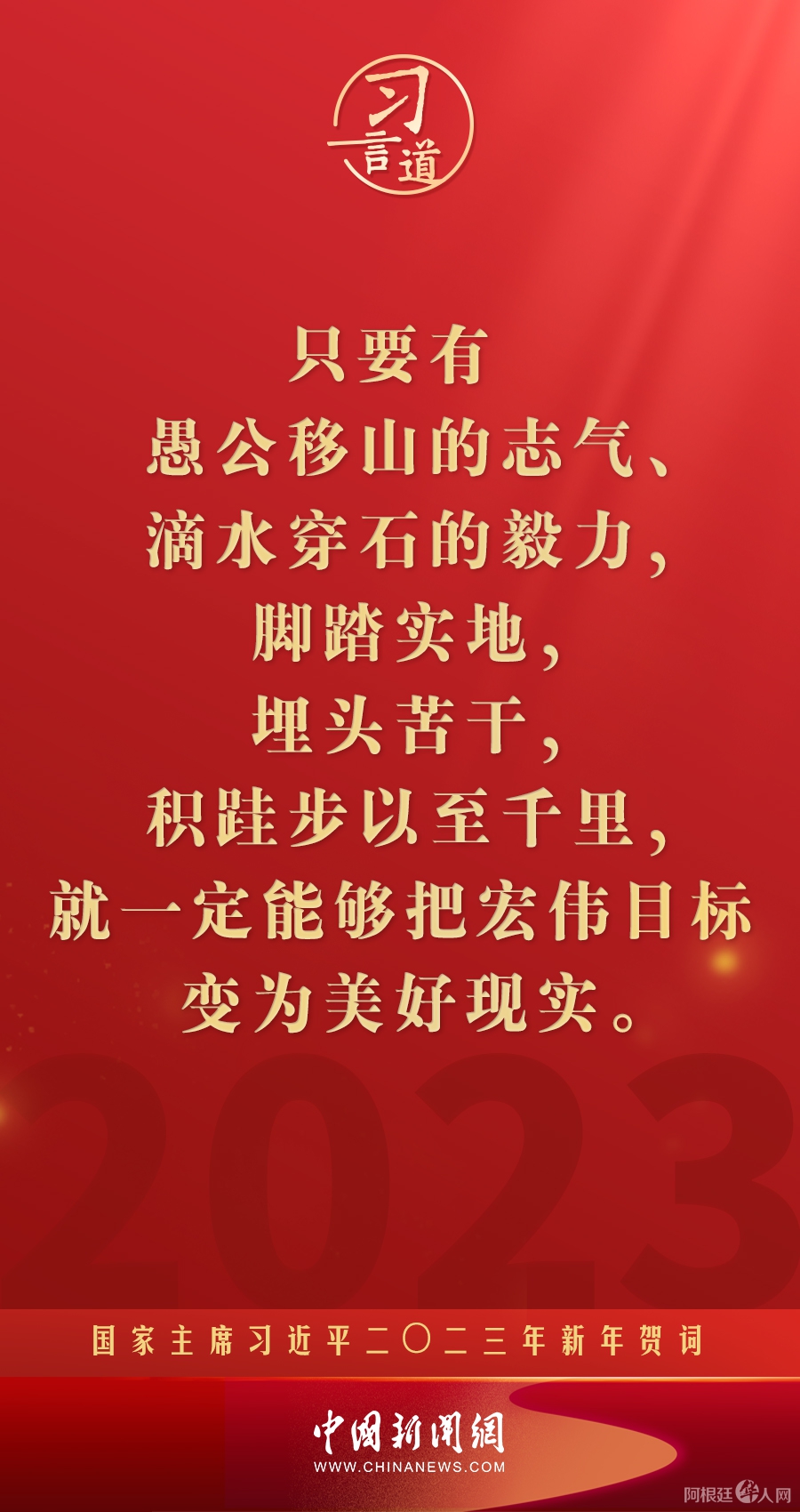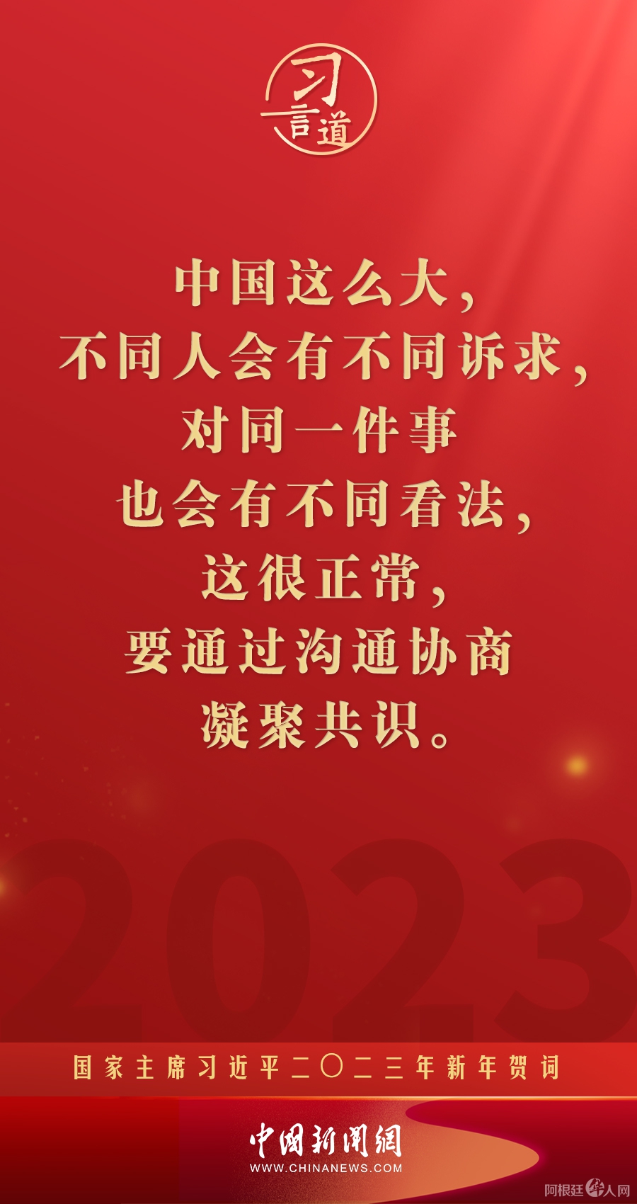 习言道|再加把劲!习近平“新年金句”暖心提气 中国新闻网 • 2023-01-02 04:43• 收藏本文 新年前夕,国家主席习近平通过中央广播电视总台和互联网,发表了二〇二三年新年贺词。他指出—— 转载本网稿件,原则上需要书面授权,不得篡改稿件主题。本网随时有权要求第三方停止侵权行为。 本网所载内容或图片,若涉及侵权,请联系删除。 02 ___________ 2023/01 习言道|再加把劲!习近平“新年金句”暖心提气 新年前夕,国家主席习近平通过中央广播电视总台和互联网,发表了二〇二三年新年贺词。他指出—— [ 微信长按识别二维码或扫码查看分享内容 ]