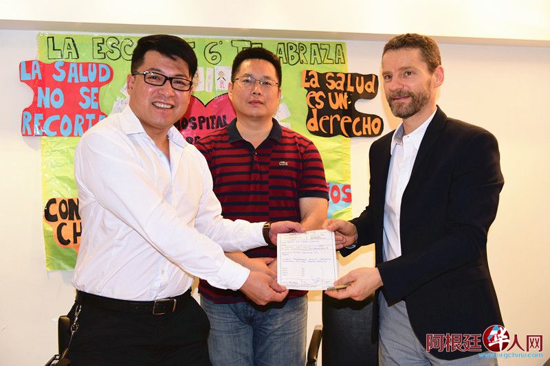 (阿根廷华人网11月29日讯 柳 军/文、图)今天下午,歌手张金良在中国驻阿使馆陈志军领事的陪同下来到阿根廷儿童医疗基金会,将27日晚举办的演唱会所得善款十五万阿币送到基金会创办人Adriano Jaichenco 先生手中,表达了旅阿华人关注阿根廷患病儿童和积极施善的热情。阿根廷儿童医疗基金会对旅阿华人的爱心奉献表示真挚谢意!