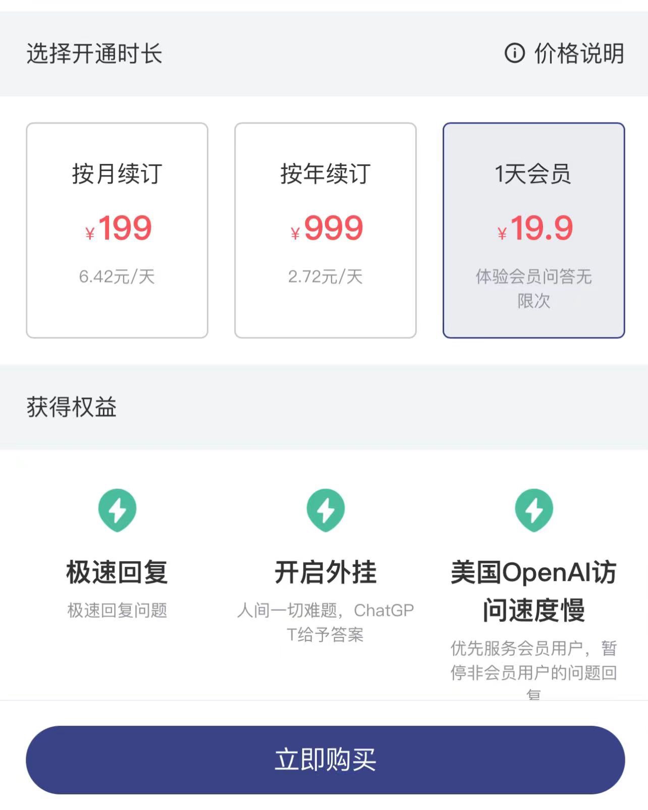 中新财经进入的一个公众号显示“点击链接chatgpt中文版免费使用。”然而点进去还没操作,就显示“您今天的免费体验已用完次数”。而该公众号提供的VIP服务,收费为:1天会员为19.9元,按月续订为199元,按年续订则为999元。