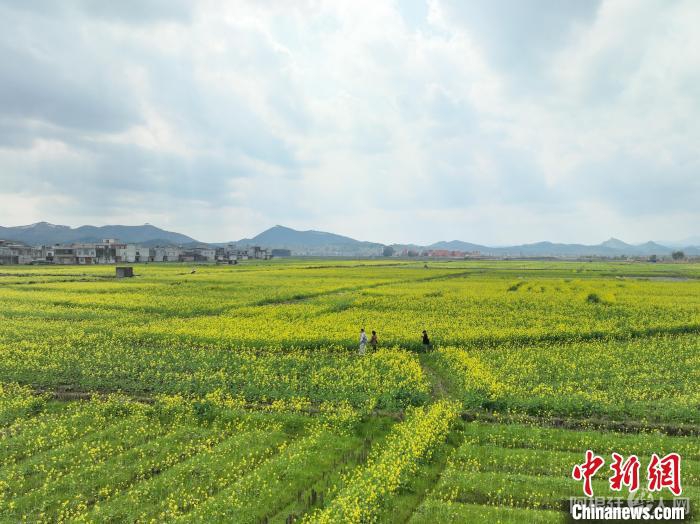游客在油菜花海中赏花、拍照。陈冠言 摄