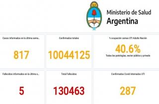 (阿根廷华人网2月27日讯 黄东)据阿根廷卫生部本周一通报,最近一周内全国新增新冠病例817例,较前一周的1172例下降了30%;新增死亡病例5例,较前一周下降了28.5%。