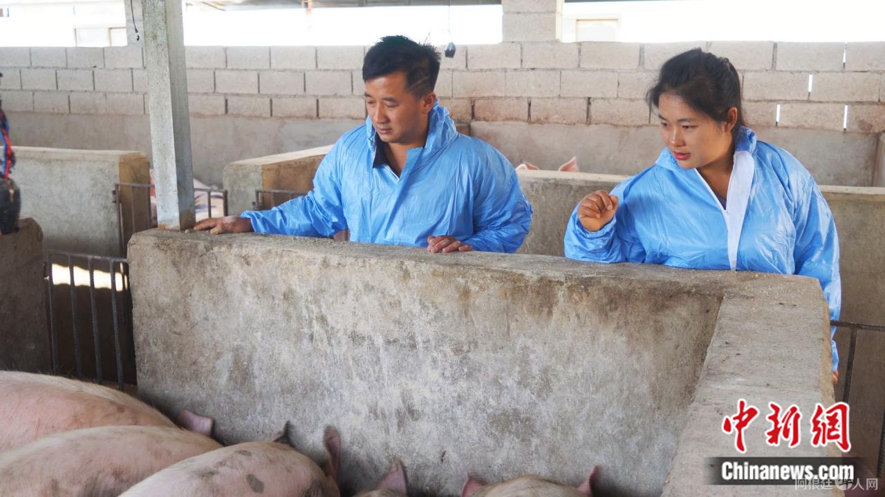 图为李志娟(右)在养猪场检查养殖情况。 杞艳芹摄