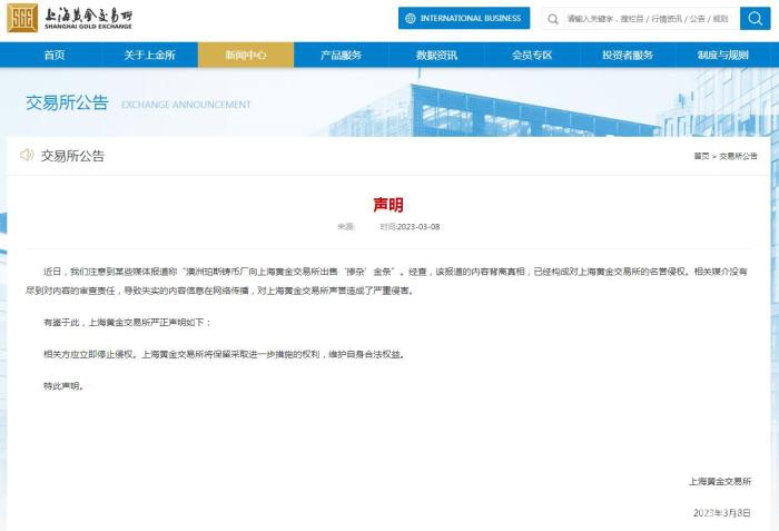 针对“澳洲珀斯铸币厂向上海黄金交易所出售‘掺杂’金条”的媒体报道,上海黄金交易3月8日发布声明称,经查,该报道的内容背离真相,已经构成对上海黄金交易所的名誉侵权。相关媒介没有尽到对内容的审查责任,导致失实的内容信息在网络传播,对上海黄金交易所声誉造成了严重侵害。