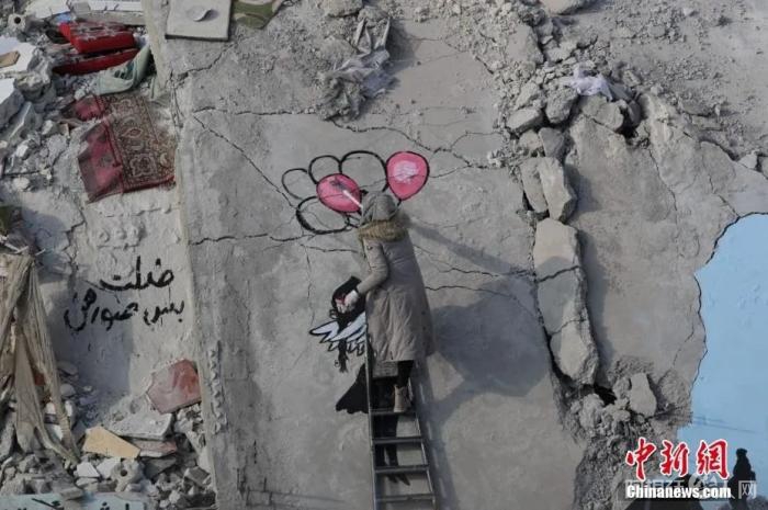 当地时间2023年2月22日,叙利亚阿勒颇,地震发生后,叙利亚艺术家在地震废墟上画画,描绘出缅怀与希望。