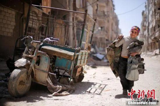 2018年4月16日,遭到轰炸后的第二天,大马士革的生活一如往常,一个男孩抱着防弹背心走在破败的马路上。