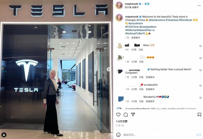 3月25日,梅耶发表的帖文显示,她已经抵达了成都,并在“漂亮的特斯拉门店”前和特斯拉标志合影。在这条帖子中,梅耶还加上了“埃隆·马斯克”和“自豪的母亲”等标签。