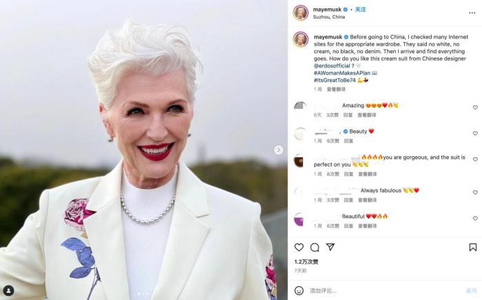 梅耶·马斯克身穿中国品牌西装。(图片来源:梅耶社交媒体截图)
