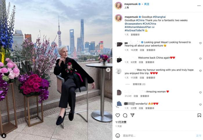 梅耶在社交媒体上还写道:“(在苏州)沿着公园散步,看到美丽的鲜花盛开,真是太棒了。我还去了一个有500年历史的老房子,了解了(以前的)人们是如何生活的……我在中国玩得很开心。”
