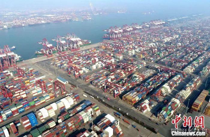 资料图:山东港口青岛港2021年完成货物吞吐量6.3亿吨,居世界第四位。(无人机照片) 张进刚 摄