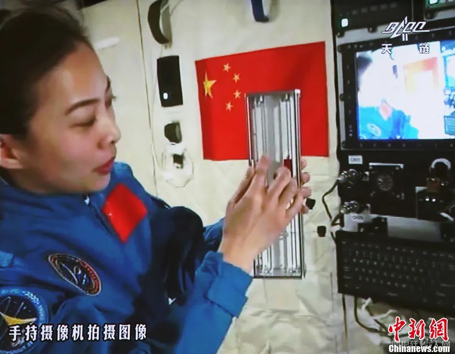 2013年6月20日10时许,神舟十号航天员在天宫一号开展基础物理实验,为青少年进行中国首次太空授课。图为王亚平讲授质量测量。中新社发 秦宪安 摄