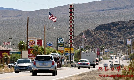 汽车经过美国加州贝克市约41米的温度计。(自《卫报》)