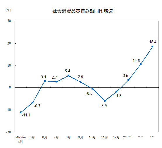 国家统计局5月16日公布的数据显示,4月份,社会消费品零售总额34910亿元,同比增长18.4%,比上月加快7.8个百分点。