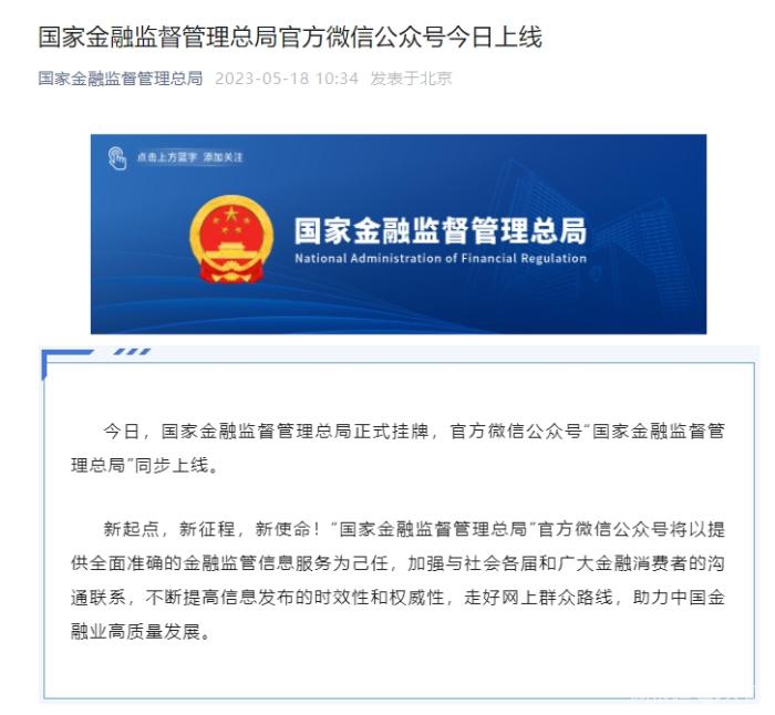 记者注意到,18日,国家金融监督管理总局官方微信公众号“国家金融监督管理总局”同步上线,“国家金融监督管理总局”官方网站也正式启用。