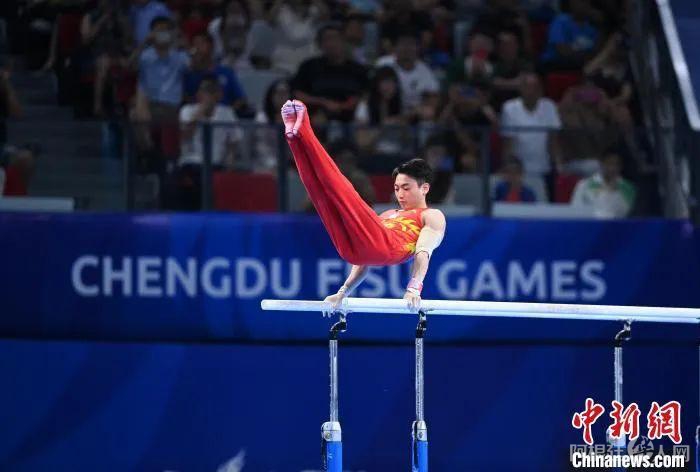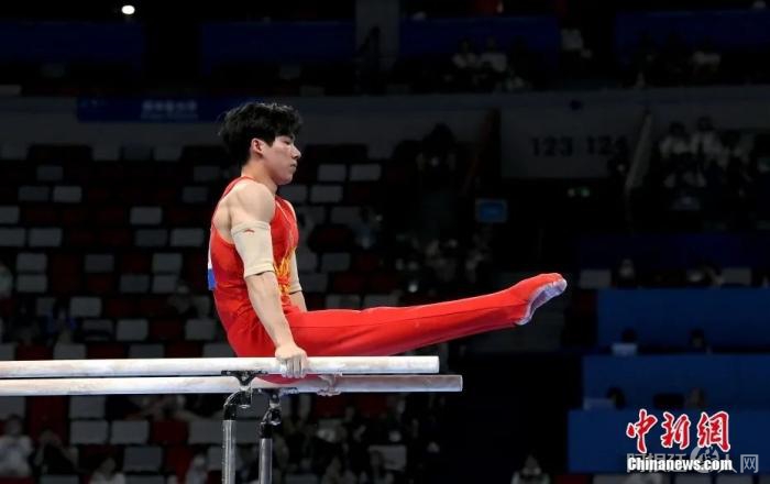 张博恒在进行双杠比赛。安源 摄