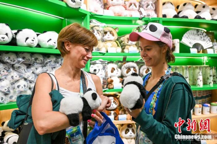 8月1日,成都大运会期间,成都大熊猫繁育研究基地成为参赛代表团的热门打卡点,图为匈牙利选手凡妮(右)选购大熊猫玩偶。赵文宇 摄