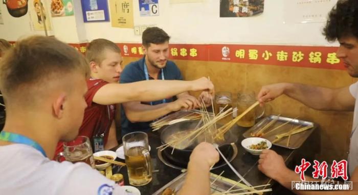 7月31日晚,成都大运会波兰代表团成员马钦凯维奇(中)品尝成都串串香。吕杨 摄