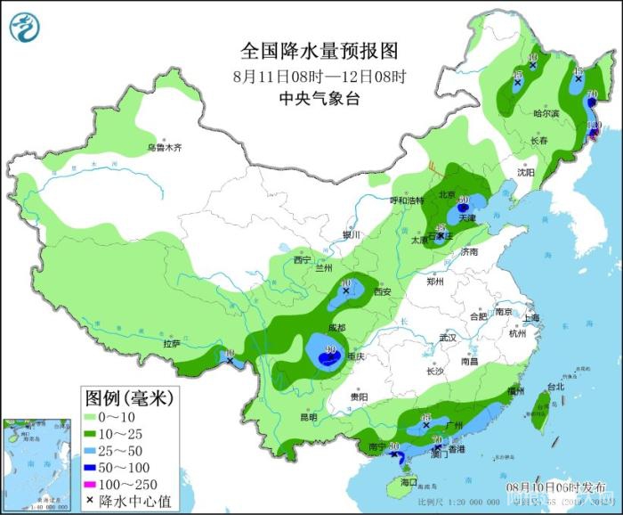 图2 全国降水量预报图(8月10日08时-11日08时)