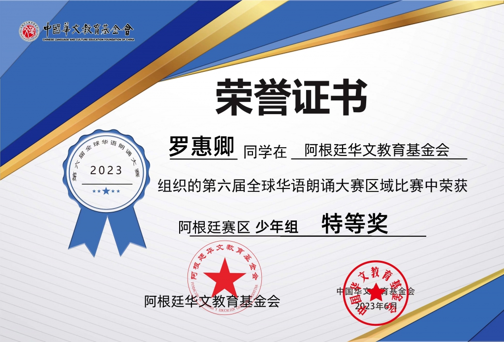 由中国华文教育基金会主办,完美(中国)有限公司资助,北京时间有限公司承办的第六届全球华语朗诵大赛,阿根廷赛区富兰克林中文学校罗惠卿获得青少组金奖、姚靓获得少儿组铜奖,华夏中文学校陈馨怡获得少年组铜奖。
