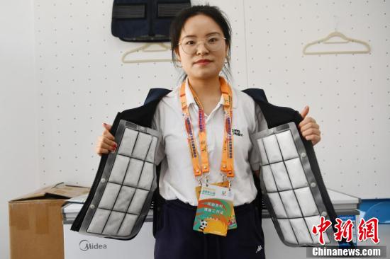 7月5日,成都大运村工作人员向媒体展示了降温冰背心。这些背心采用PCM(新型恒温材料)制成,将广泛运用于大运会志愿者群体,帮助其在夏季保持冰爽。降温冰背心具有存储和释放潜热调节剧烈温差的功能,是通过自身相态转换来进行吸热或放热,并根据环境温度的变化在服装周围形成温度相对恒定的微气候,实现温度调节功能,从而达到温度始终保持在18℃/23℃/28°C,相当于随身携带了一个“空调”,使用时只需要把“内芯”提前半小时放入冰箱,就可以在30多摄氏度的户外,持续提供2个小时的“清凉”。图为工作人员展示降温冰背心。