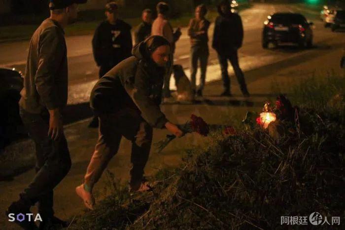 当地时间24日,有人前往瓦格纳大楼献花。图片来源:社交媒体频道“灰色地带”。