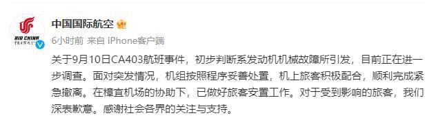 国航通报CA403航班事件:初判系发动机机械故障引发