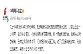 中新网9月11日电 据中国国际航空官方微博消息,国航就CA403航班事件发布通报。通报称,9月10日CA403航班事件初步判断系发动机机械故障所引发,目前正在进一步调查...