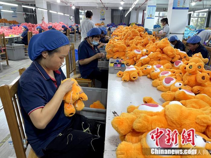 在手工车间内,工人们正埋头为毛绒玩具缝合充棉口。不久后,这些精致的毛绒玩具就将漂洋过海,进入国际市场。据了解,目前,安康市毛绒玩具企业吸纳就业1.8万人,实现产值51.67亿元,已成为全国第四大毛绒玩具生产基地。“许多国家愿意把玩具订单交给安康企业来做,产品出口国家已经超过80个。”安康市人社局副局长李万华告诉中新网。
