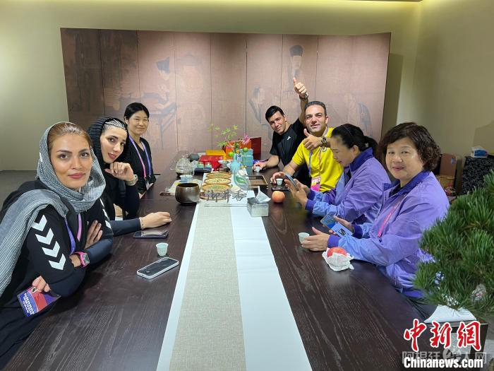 9月25日,来自伊朗的技术官员品杭州桂花龙井。 张淑娜 摄