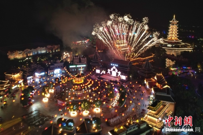 资料图:9月30日,漫天焰火在长沙方特升空,吸引众多游客围观。中新社记者 杨华峰 摄