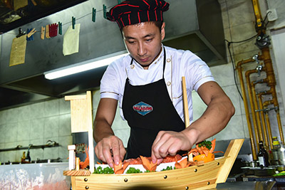 唐人福酒家主厨师施先生,正在制作中华美食菜品。