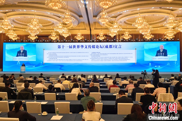 中新社成都10月24日电 (记者 金旭)第十一届世界华文传媒论坛24日于成都闭幕。论坛期间,来自59个国家和地区的300多家华文媒体代表尽抒所见,凝聚共识,达成《成都宣言》。中国新闻社总编辑张明新在闭幕式上宣读了宣言。