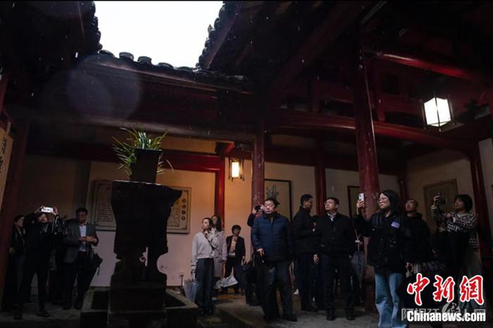 图为记者团在兴贤古街采访。中新网记者 李骏 摄
