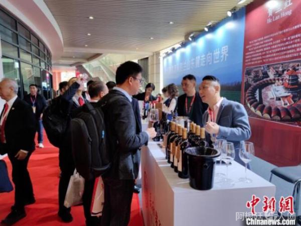 观展商与参展商交流葡萄酒品牌。傅飞扬 摄