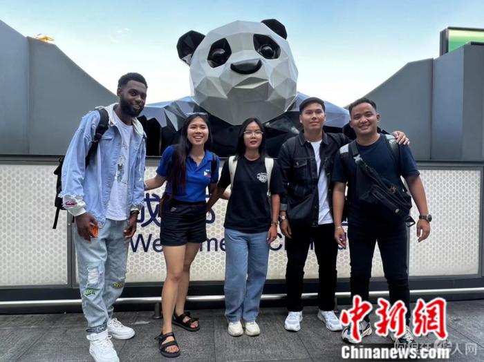 任瑞(左一)和其他留学生在成都。受访者供图