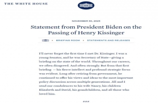 中新网12月1日电 综合报道,美国前国务卿基辛格于当地时间11月29日去世,享年100岁。当地时间11月30日,美国白宫网站发布了拜登的哀悼声明。