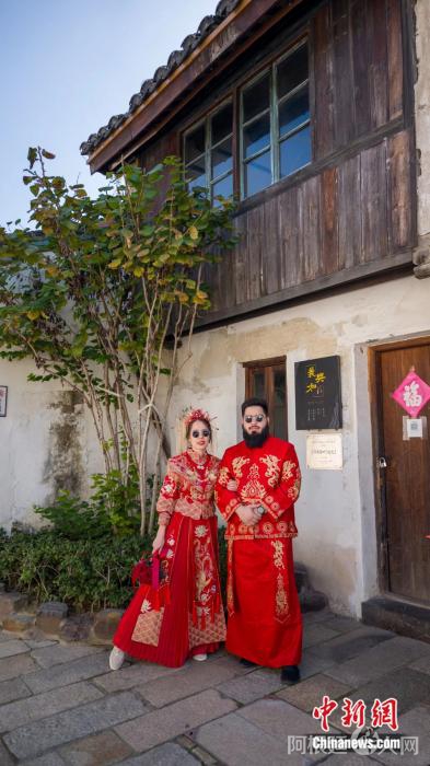 就在不久前,美莎和沙呐沙拍了中式婚纱照,身着红色秀禾服的美莎选择与先生在白墙灰瓦的中式园林建筑中留下二人爱情的见证。而两人的婚礼也颇有戏剧性,双方父母在土库曼斯坦家乡为两人办酒,没能回国的他们则通过视频远程参加了自己的婚礼,接受家人们的祝福。美莎笑称,她的微信婚礼很特别,很能代表中国速度。