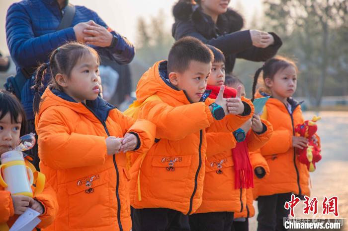1月11日,广西“小沃柑”在孔子故里山东曲阜学习拱手礼。 植丰 摄