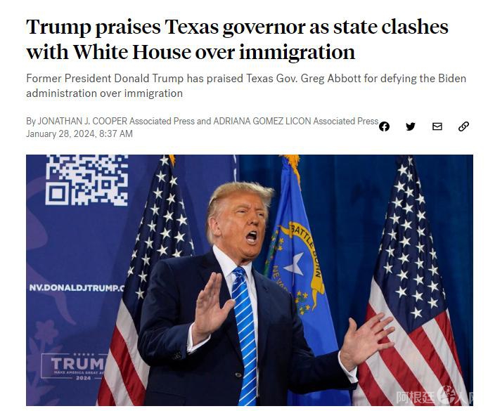 据报道,特朗普27日在一场以边境安全为主要议题的演讲中表示,应全力支持得克萨斯州在美墨边境采取的遏制非法移民的措施,并称赞阿博特在该问题上采取的举措。