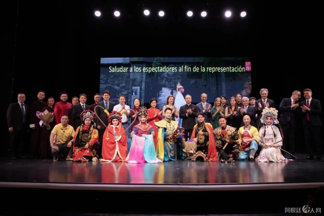 演出结束后,王大使与蒙迪诺外长等嘉宾登台,祝贺演出圆满成功。蒙迪诺接受采访时表示,阿中友好关系紧密,前景广阔,向中国人民致以新春祝福。来宾们盛赞中华传统文化源远流长,中国戏曲艺术博大精深,祝愿阿中人文交流和两国友好合作不断向前发展。