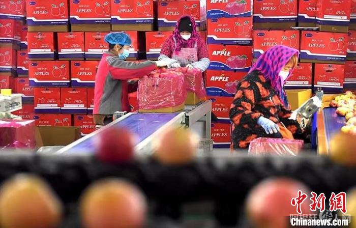 (资料图)沂源县中庄镇的一家苹果销售企业内,工人们正在装箱。赵东山 摄