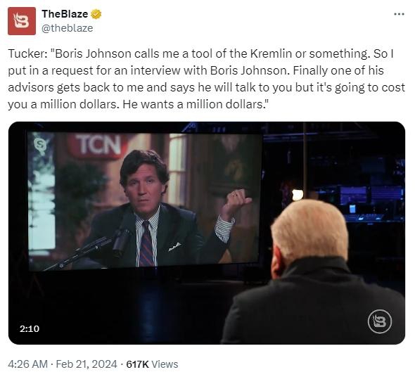 中新网2月21日电 综合外媒消息,近日,美国记者卡尔森在接受美国新闻网站“TheBlaze”的采访时透露,他此前曾试图采访英国前首相约翰逊,但约翰逊要卡尔森支付100万美元才同意接受采访。