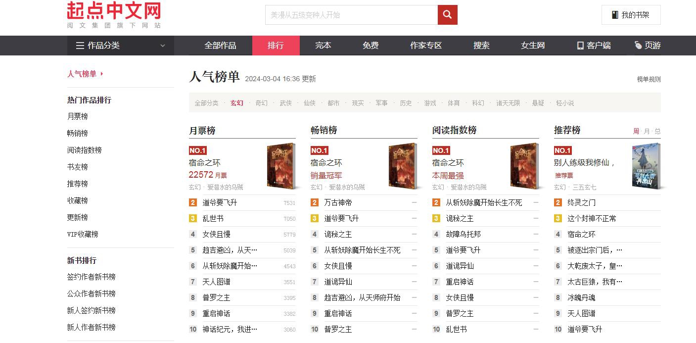 起点中文网玄幻小说人气榜单。起点中文网截图
