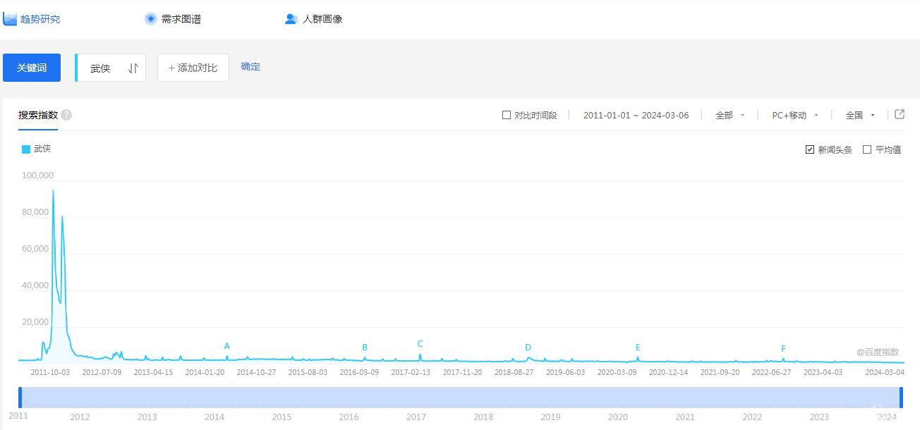 花开花落,少年子弟江湖老。几十载春秋过去,如今的武侠小说陷入尴尬境地,令人唏嘘。据百度指数,“武侠”在2011年凭借甄子丹、金城武主演的同名电影迎来最后的热度巅峰后,一路“躺平”。