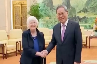 中新社北京4月7日电 中国国务院总理李强4月7日上午在北京人民大会堂会见美国财政部长耶伦。