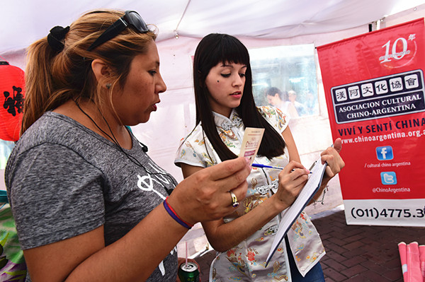 汉阿文化协会摊位前,阿根廷市民正在报名学习汉语。