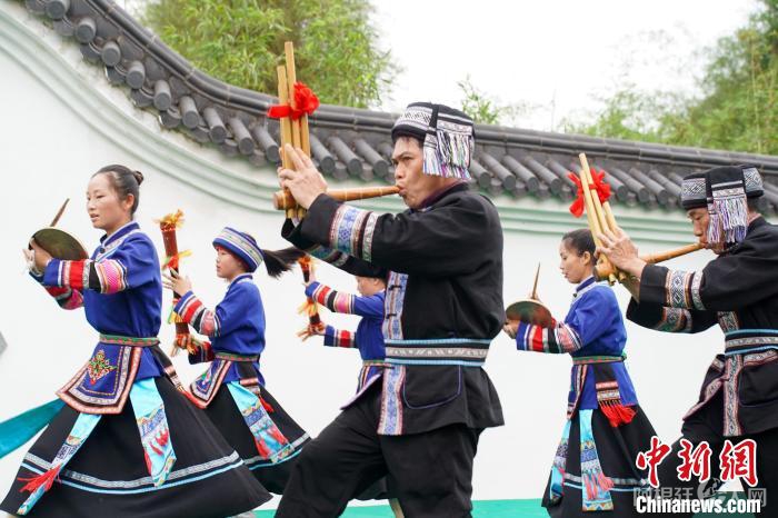 4月11日,2024年“广西三月三·八桂嘉年华”文化旅游品牌活动在南宁市青秀山风景区开幕,表演者在演奏芦笙等乐器。陈冠言 摄