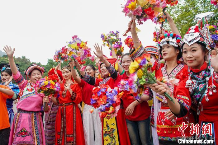 4月11日,在广西南宁市青秀山风景区,民众身着民族服饰欢度“三月三”。陈冠言 摄