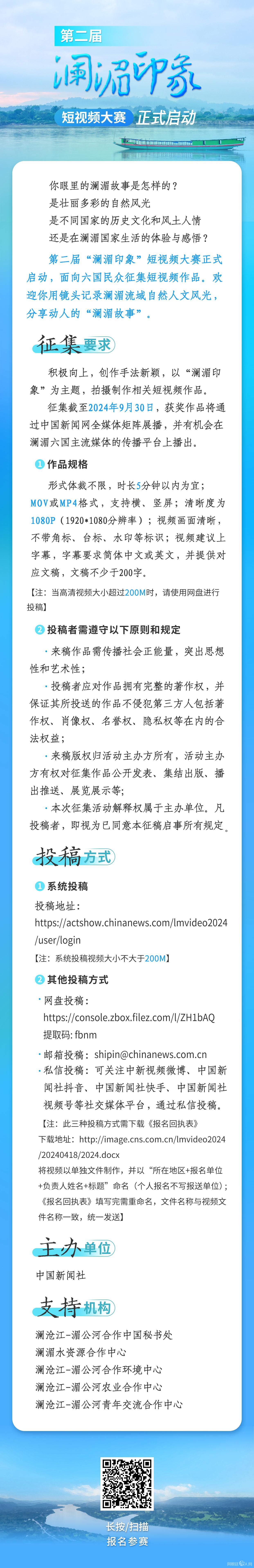 此次短视频大赛专门设立征集投稿系统(https://actshow.chinanews.com/lmvideo2024/user/login),参赛选手可登录系统提交原创作品。大赛将于2024年9月底结束征集。主办方将评选出获奖作品,并予以奖励。